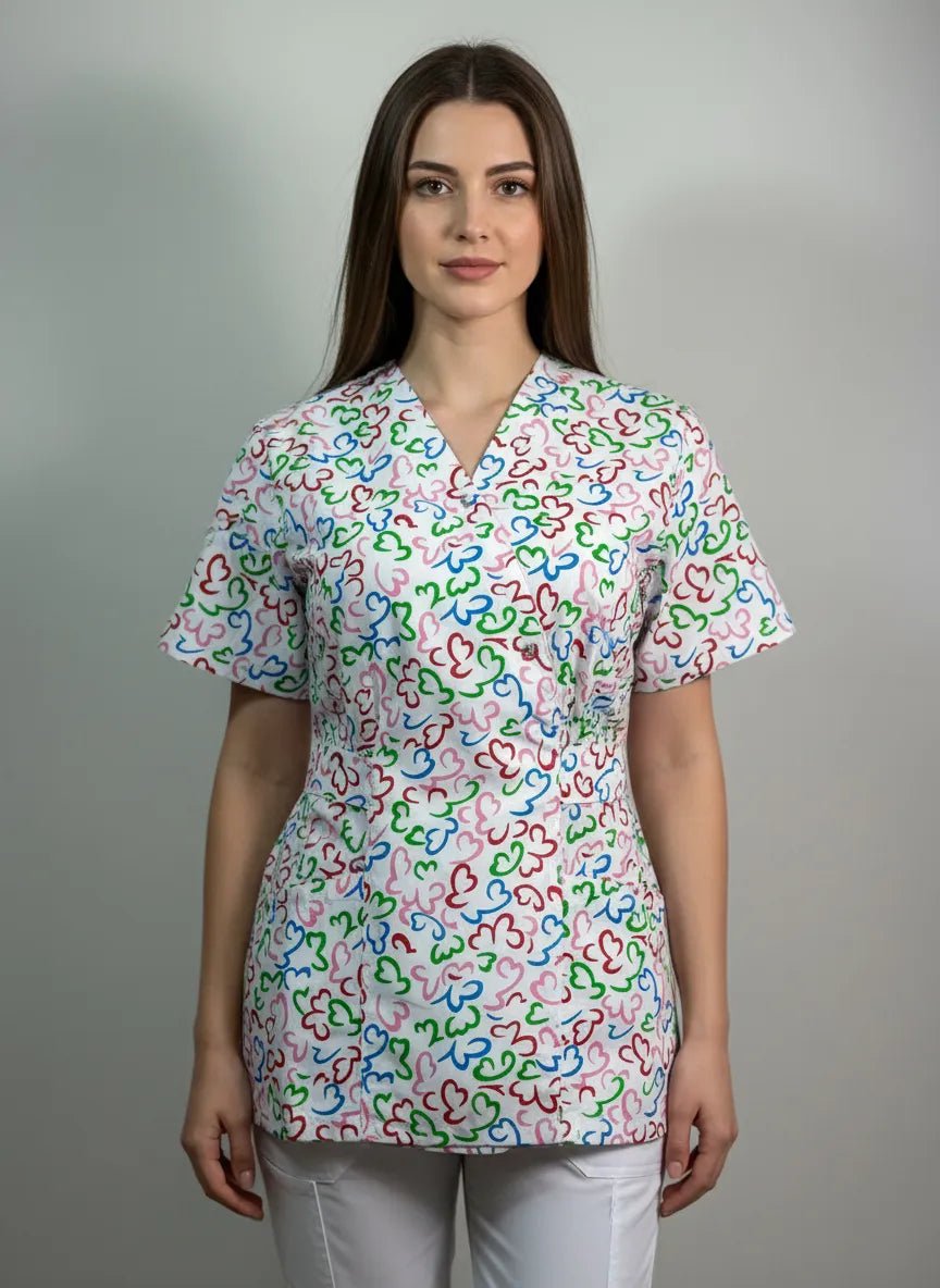 Elegáns blúz szép mintával, amely stílusosan teszi teljessé orvosi felszerelését! A sokszínű szívek blúz, gyönyörű szívmintával, mosolyt csal az arcára minden alkalommal, amikor viseli. Nem tévedhetsz ezzel az aranyos blúzzal!