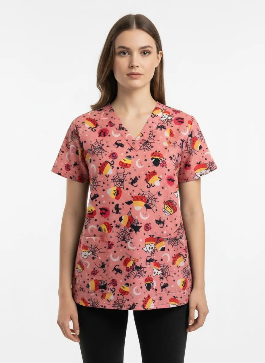 Válasszon egy színes női orvosi blúzt Halloween Eggs nyomattal, elasztánnal, hogy stílusosan kiegészítse kórházi vagy irodai egyenruháját. Ennek a blúznak a színei élénkek, és friss levegőt hoznak orvosi öltönyébe.