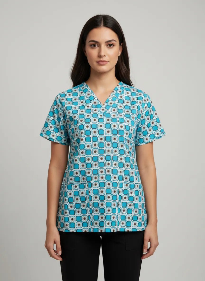 Világszerte a legnépszerűbb orvosi öltönytípus, helyi és nemzetközi nyilatkozat, orvosok és nővérek a világ minden tájáról választották ezt a modellt. A vidám minta illeszkedik dinamikus és energikus természetéhez. Ez a blúz nagyon sokoldalú, három zsebbel rendelkezik, kettő az oldalán az alsó részben és egy a mellkason, a felső részen. Amikor belép az orvosi rendelő ajtaján, kéznél tarthatja telefonját vagy más fontos tárgyait a blúz alsó részén található két nagyvonalúan kivágott zsebben.