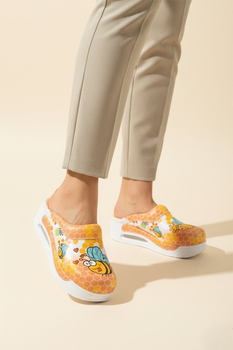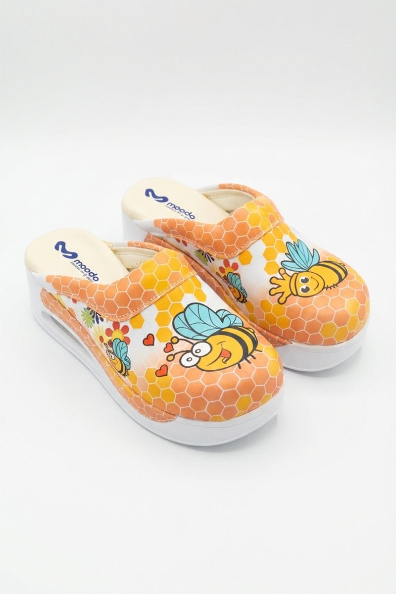 O pereche de saboti medicali simpatici cu model Bee! Papucii medicinali cu talpa ortopedica au un design care poate fi purtat atat de femei cat si de barbati.